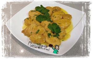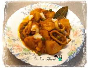Calamares con patatas, guisados con un toque de bacalao confitado