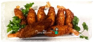 5. Freír. Calienta abundante aceite a 170–180 °C. Fríe las gambas durante 1–2 minutos, hasta que estén doradas y crujientes. Retíralas y colócalas sobre papel absorbente para eliminar el exceso de aceite.