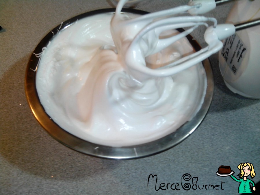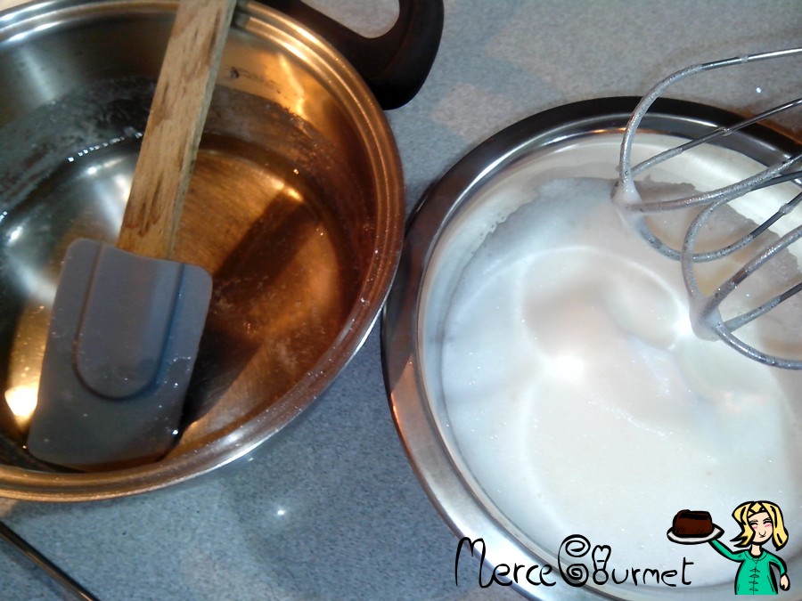 Una vez alcanzada dicha temperatura, lo iremos incorporando dentro del bol, donde tenemos las claras reservadas. Ya tenemos nuestro merengue hecho.