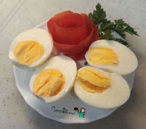 - Hierve los huevos con sal y un chorrito de vinagre durante 10 minutos desde que empieza a hervir el agua. Luego enfría con agua fría, pélalos y resérvalos.