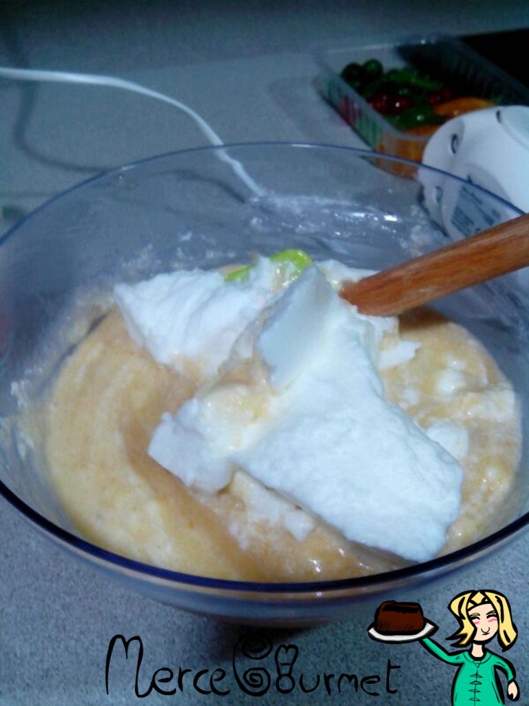 Incorpora poco a poco la mezcla de melocotón y leche condensada a la nata montada. Hazlo con movimientos suaves y envolventes, para que la nata no pierda volumen.