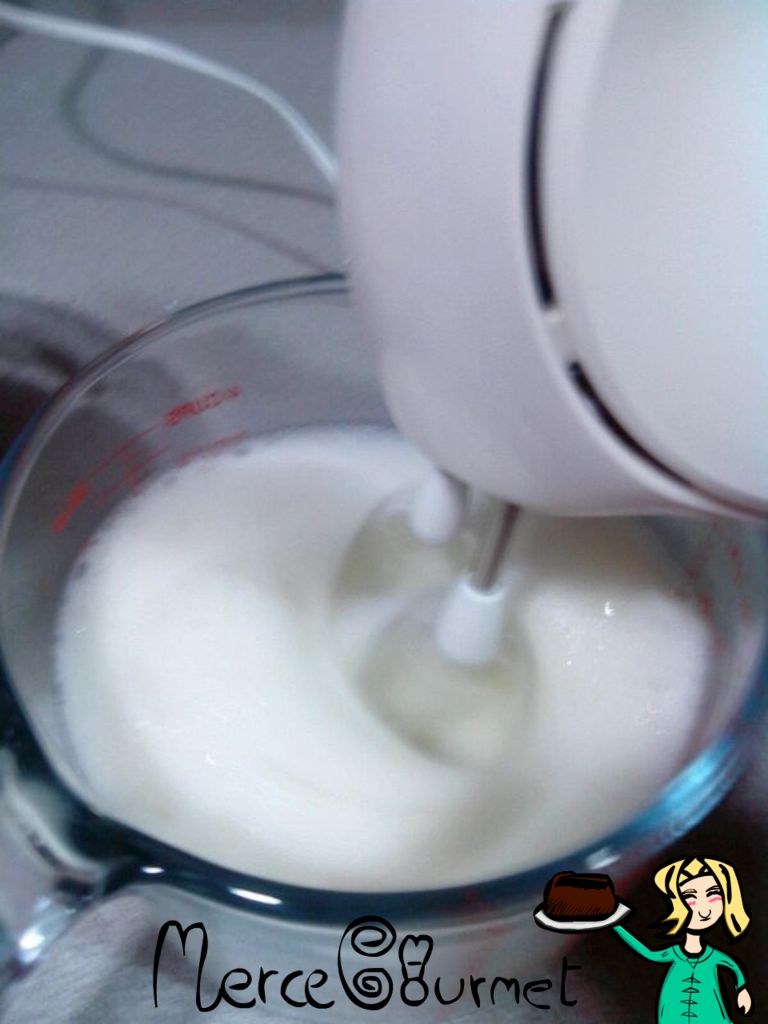 En otro bol, vierte la nata muy fría. Bátela con varillas eléctricas hasta que empiece a espesar. Añade las 2 cucharadas de azúcar glas y termina de montar, pero sin pasarte (debe quedar firme pero cremosa, no cortada).
