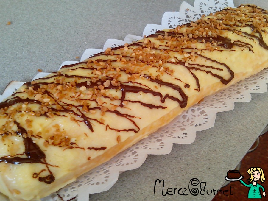- Colocaremos la última lámina, que servirá de tapa de dicha tarta de crema. Espolvorearemos por encima, azúcar glas y chocolate deshecho con el que pasaremos a dibujar unas finas líneas, para nuestra decoración.