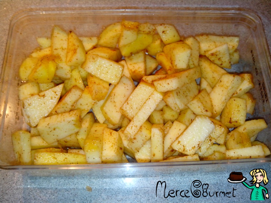 - En el momento que rompa el hervor, añadiremos la manzana, que previamente habremos lavado, quitado el corazón y cortado a gajos finitos.