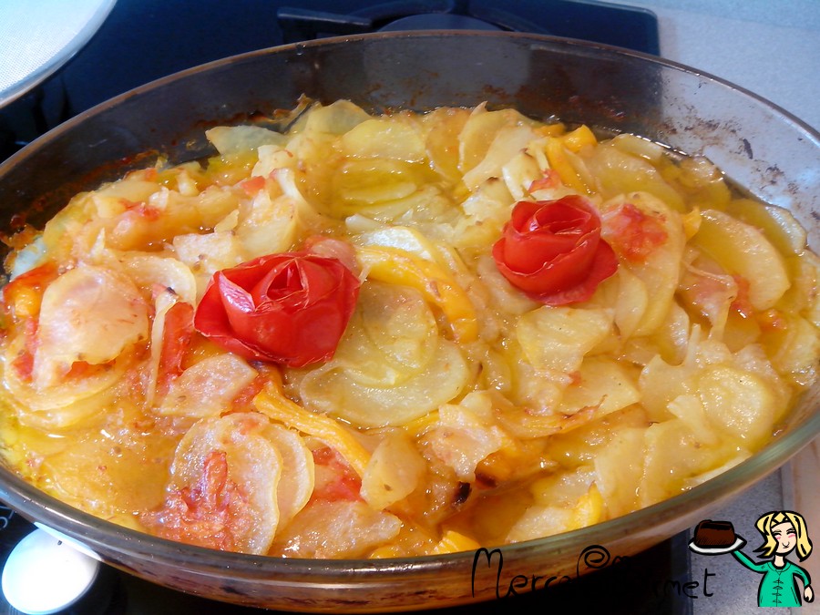 - Con las patatas que tenemos reservadas, las escurriremos y colocaremos por encima de nuestra mezcla de cebolla, pimientos y bacalao…
