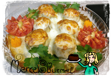 Con el puré de la manga que tenemos reservada, hacemos unos rosetones en los bordes de las conchas y doraremos ligeramente en el horno.