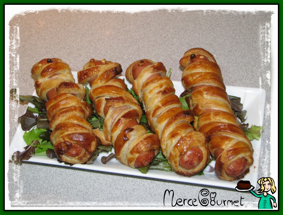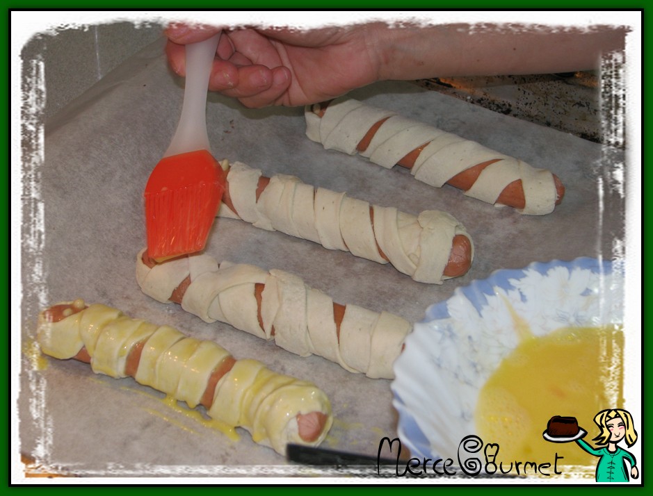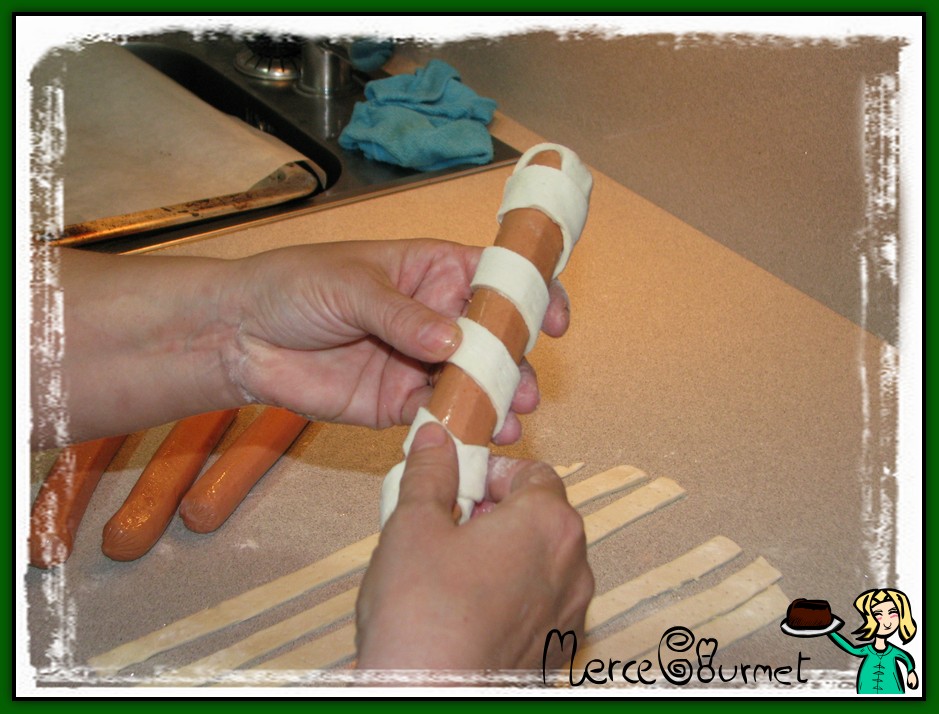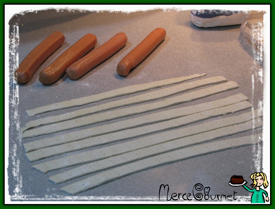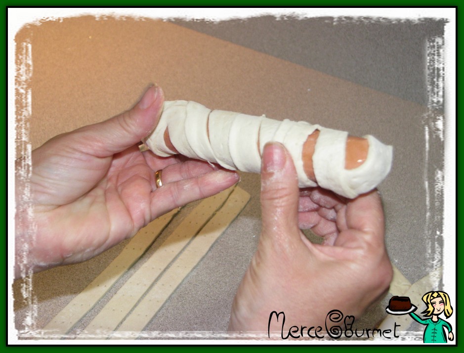 cogemos las salchichas y las envolvemos con las tiras de hojaldre recién cortadas…