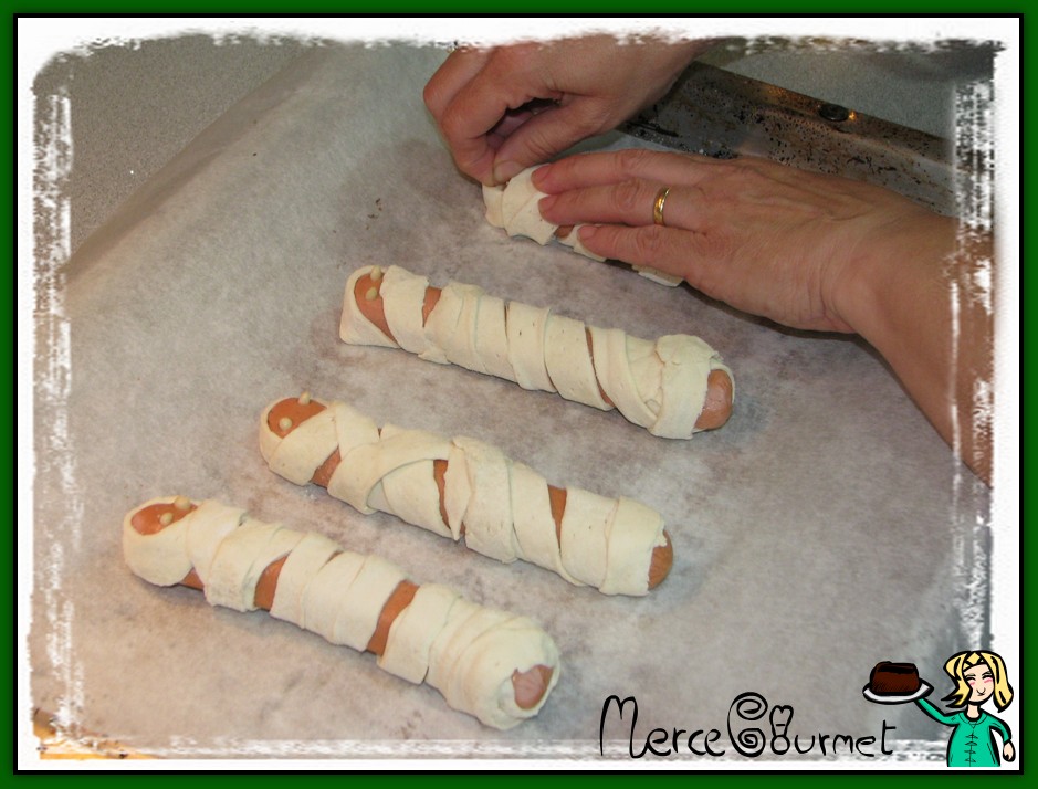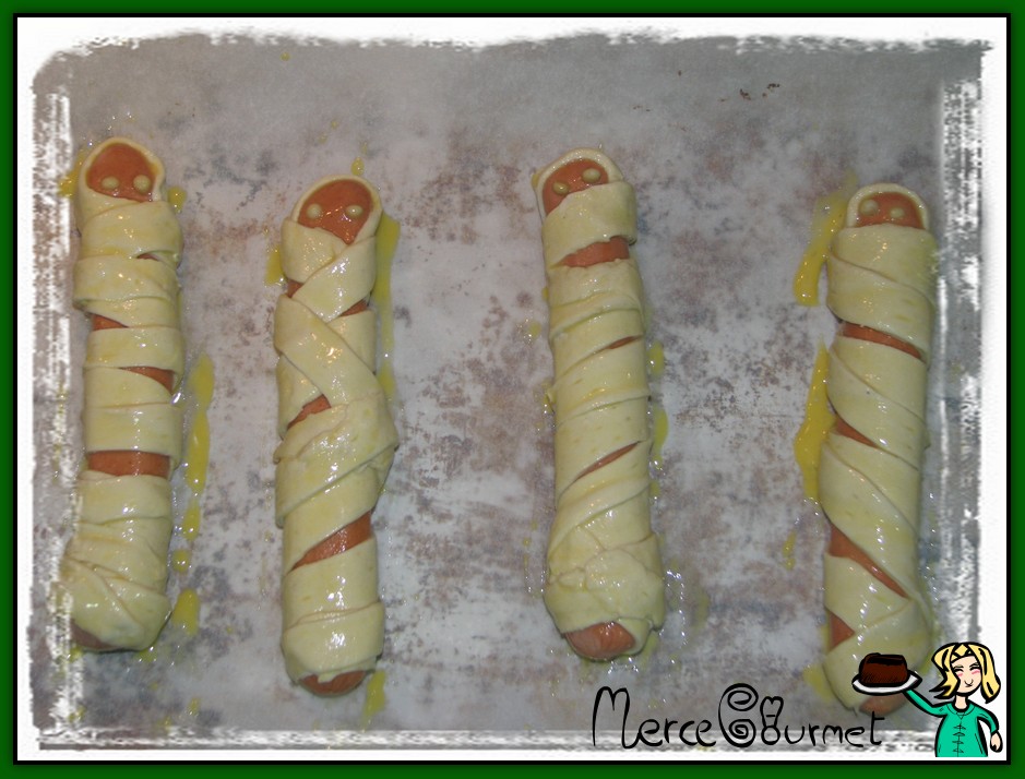 lo introducimos en el horno precalentado a 180º y lo horneamos durante 20 minutos, hasta que queden un poco doradas. Ya tenemos nuestras momias…