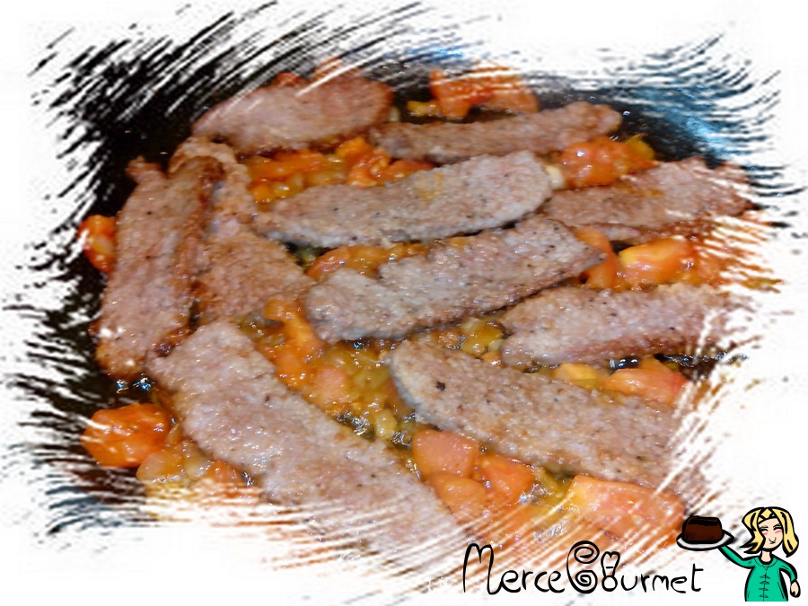 Salpimentamos la carne por las dos caras, la enharinamos, la freímos ligeramente (para que la harina no se nos apelmace) y la reservamos en un recipiente aparte.