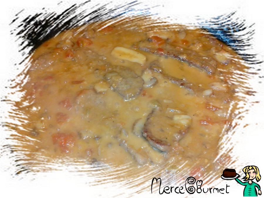 y dejamos a fuego lento que sofría y reduzca, se añade la carne que teníamos reservada y añadimos el brandy flameando el alcohol…